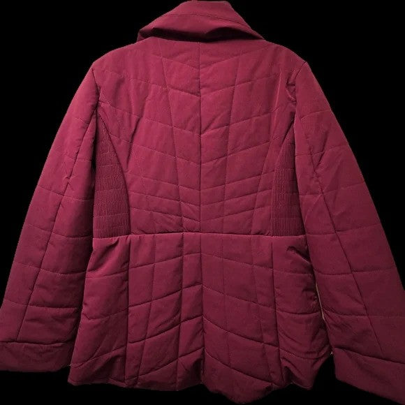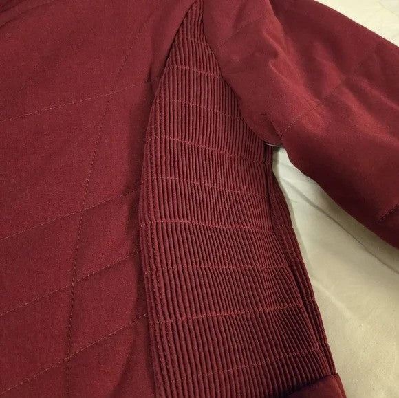 Brand new with tags and personalize any way you choose! Stylish cranberry red quilted jacket featuring ribbed elastic side panels that allow for extra movement. Zippered front and hand pockets. Nice contoured fit and long enough to cover your rear while riding. Larger collar to stand up on those chillier days.
